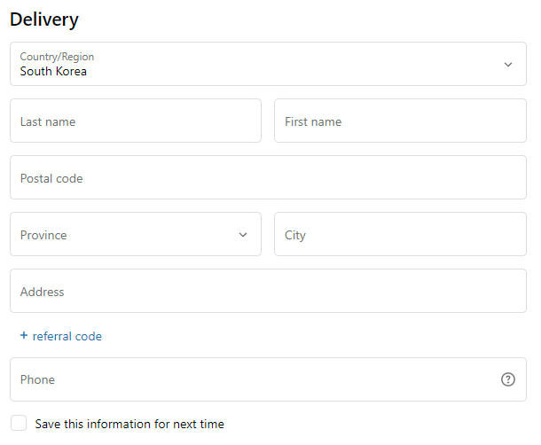 4) 주소는 한글로 입력합니다. 주소를 영문으로 입력하고 결제 방법을 선택합니다. (네이버 영문 주소 변환기)